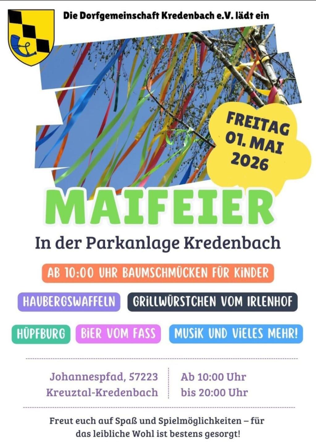 10:00 Uhr - Maifeier der Dorfgemeinschaft Kredenbach e.V. in der Parkanlage Kredenbach